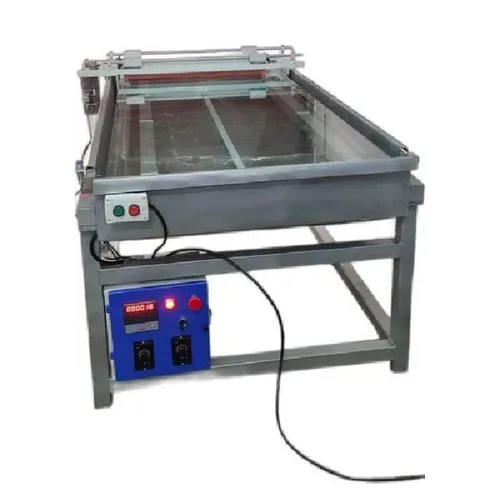 Semi-automatic brushing machine for applying rhinestones to apparel. Operates on single-phase 220V power, made of mild steel for clothing design.