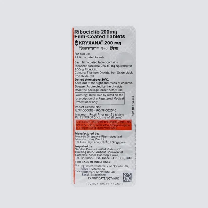 Kryxana Ribociclib Tablets, 200 mg strength. Used for breast cancer treatment. Each pack contains 21 tablets. Prescription required.