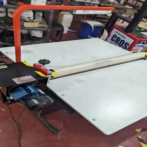 Semi-automatic metal roller die cutting machine. Single-phase, electric-powered equipment designed for precise material shaping and cutting applications. Robust construction ensures durability.