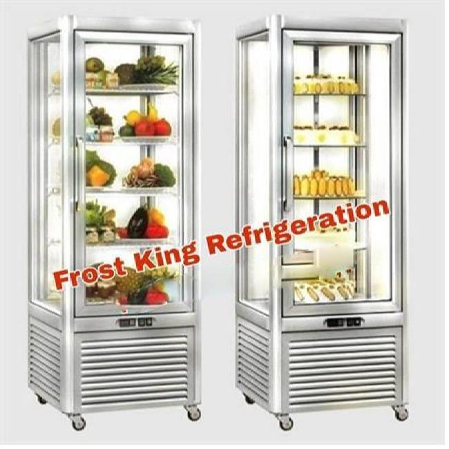 This rotary display counter features a rotating mechanism for 360-degree product visibility. Constructed from stainless steel (s.s.) with dimensions 26x28x48.