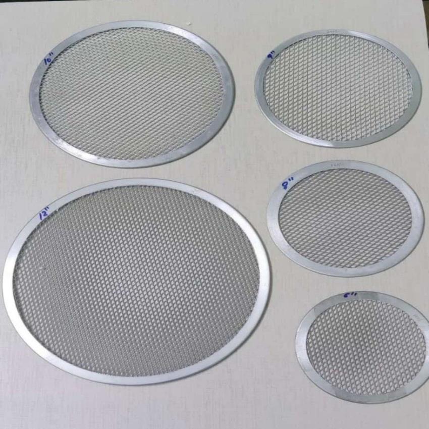Commercial aluminum pizza screen, round shape. Available in multiple sizes from 6 to 18 inches. Ideal for consistent commercial baking applications.