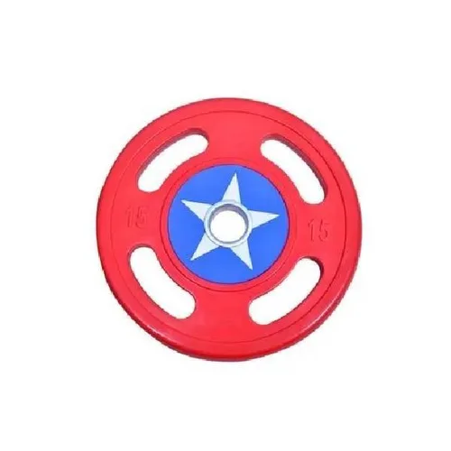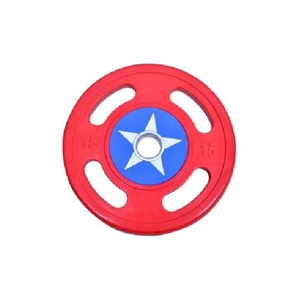 Round TPR coated fitness plate with Captain America design. Engineered for strength training, targeting chest muscles. Suitable for personal fitness applications.