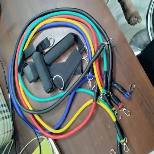 Multicolor rubber resistance bands set for household use. Includes various resistance levels for comprehensive fitness routines. Durable rubber construction ensures longevity. Packaged in a box for convenient storage.