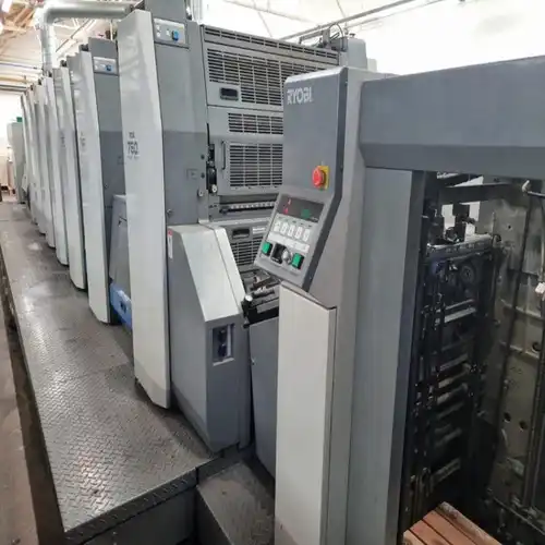 Ryobi offset color printing machine with 6-colour output. Sheet fed, 13000 RPM speed, maximum paper size 23x31 inches. This is a second-hand machine.