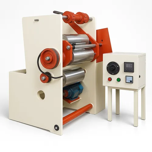 Semi-Automatic Aluminum Foil Rewinding Machine. Mild Steel construction, 440V, three-phase, 50 Hz. Features hydraulic cutting and 4 HP power consumption.