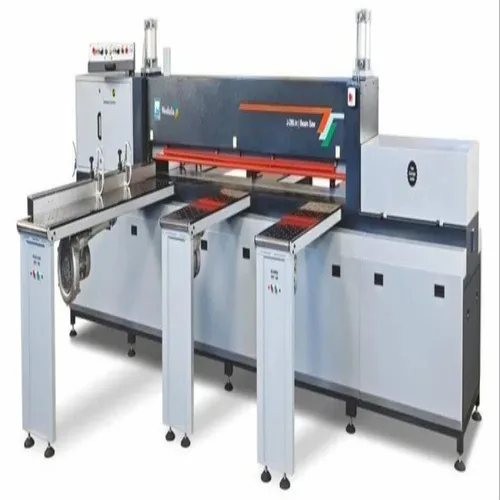 Semi-automatic beam saw machine for industrial use. Features 440V, 3-phase power, 1200W motor, and 2 HP motor. Cutting length up to 2800 mm.