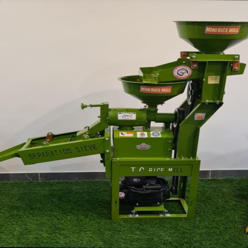 Semi-automatic rice mill machine for dehusking. Features a vibrator screen, 200kg/hr capacity, 3 HP motor, and single-phase power. Constructed from MS.