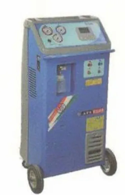 Semi-automatic AC recovery machine with 12 L refrigerant bottle. Operates on 220-240V, using R134a refrigerant. Made in India for efficient AC service.