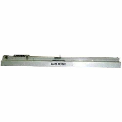 A semi-automatic crimp rigidity tester for loads from 3g to 20g. Features mild steel construction, a testing length range of 0-500mm, and India-made quality. Dimensions: 890X50X70 mm.