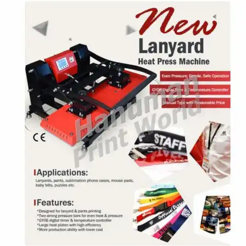 Semi-automatic lanyard heat press machine, 220V/110V, 2400W/2200W. Features digital time/temperature controller, 0-225°C range, and even heat pressure for various surfaces.