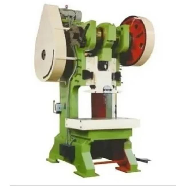 Semi-automatic C frame power press machine. Mild steel construction, 100 ton capacity, powered mechanically. Suitable for industrial applications.