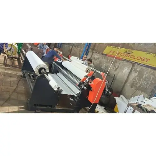 Made in India, this semi-automatic 3-phase machine handles paper material. Designed for efficient slitting and winding operations.
