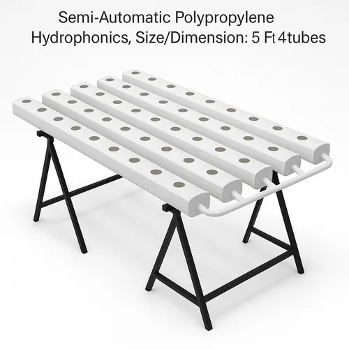 Semi-automatic polypropylene hydroponics equipment with a round shape. Designed for 25-30 plants, this system measures 5 ft with 4 tubes and is made in India from polypropylene material.