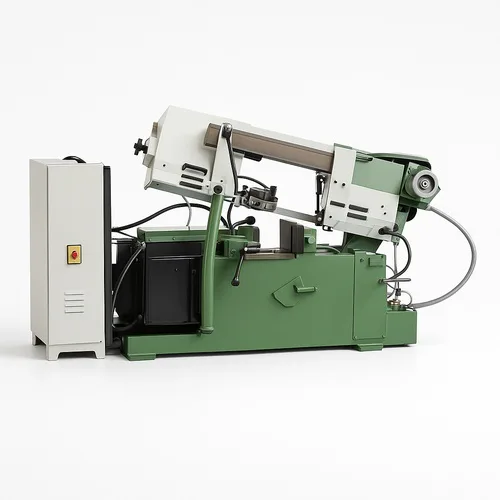 Semi and fully automatic hinge type band saw machine with 200mm round cutting capacity and 175mm square cutting capacity. Features 1.5 HP drive motor, 1 HP hydraulic motor, and 40 ltrs. coolant tank.