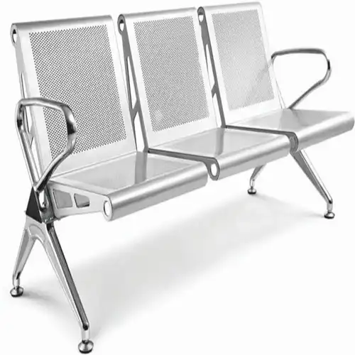 Silver, polished stainless steel multi-seater chair designed for hospital applications. Features a 3-seater capacity and made in India.
