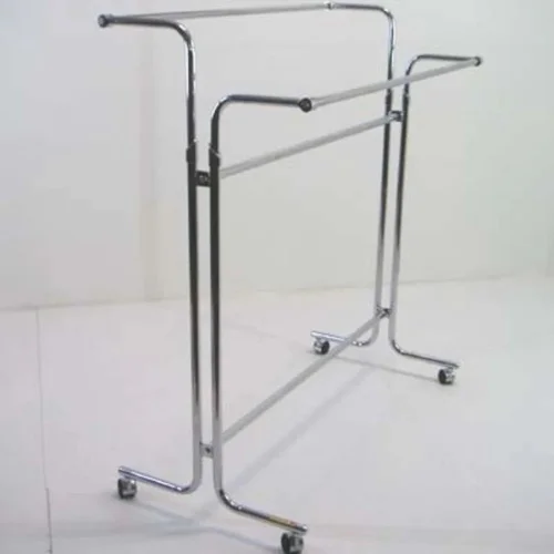 Movable, free-standing clothing rack in polished stainless steel (SS304). Size: 5x2x6 feet (LxWxH). Silver color, designed for clothing stores.
