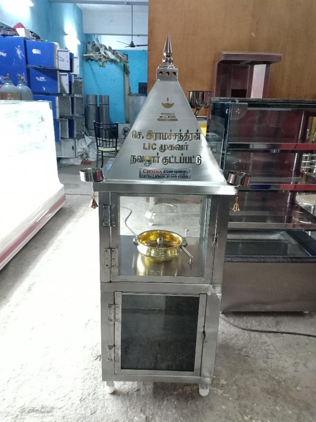 Handmade stainless steel peacock kovil vilaku, 3.5ft height. Silver coating finish with a closed lamp feature. Weight 18kg, mat surface treatment.