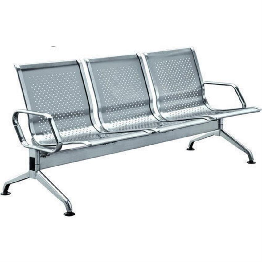 Elegant silver stainless steel waiting chair designed for office use. Features SS 304 grade material and includes armrests, accommodating 3 people. Offers durability and style.