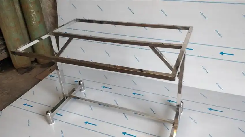 Silver stainless steel table base for restaurant use. Size 1100x500x750mm with 750mm table height. Requires assembly. Customized design.