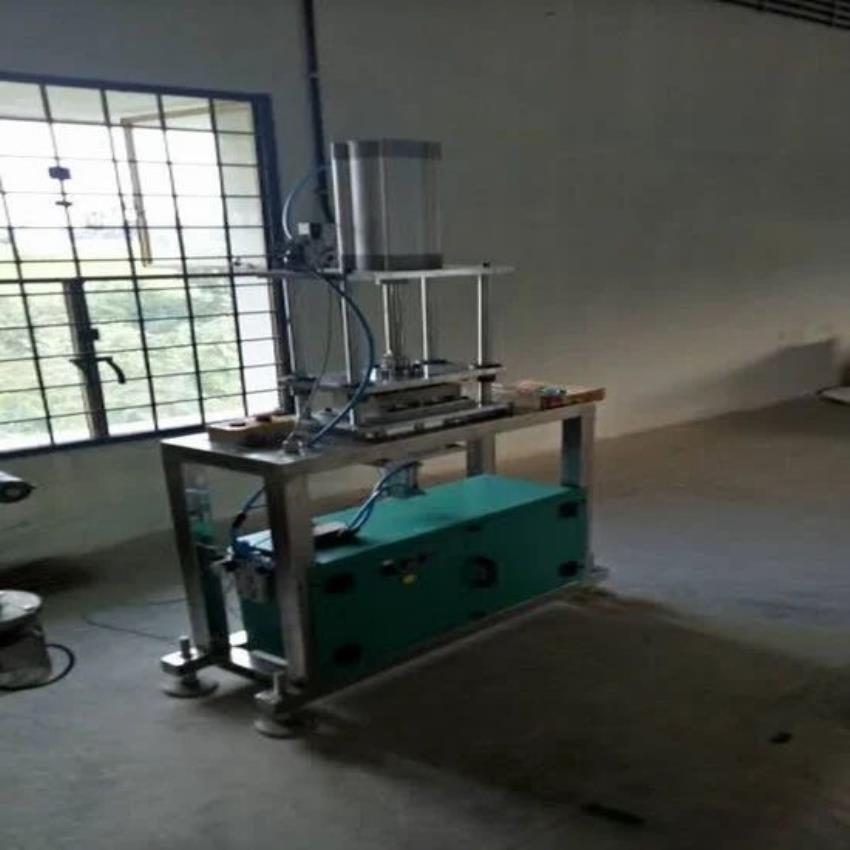 Semi-automatic single cavity pneumatic stamping equipment for soap. Features SS contact parts, 2HP motor, 50Hz frequency, 220V voltage, and 10 bar pressure. Includes 1-year warranty.