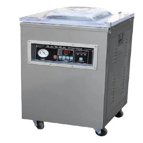 Single phase vacuum packaging machine. Operates on 230V, 50 Hz with 650W power and 0.5 HP motor. Constructed with SS material for reliable performance.