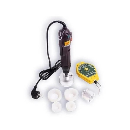 Semi-automatic, single-head handheld electric capping machine with 80W power consumption. Operates at 50Hz and 220V, achieving 45 caps per minute.