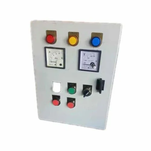 A 50 Hz, single-phase control panel for submersible pumps, rated 220 V and handling 6-10 A. Constructed from mild steel.