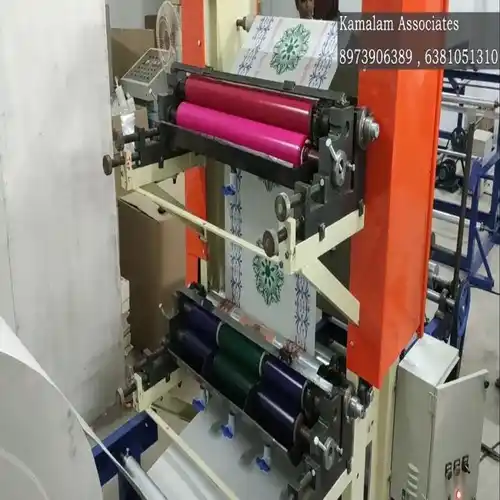 Automatic blue mild steel flexo printer. 230V, 2000mm web width, prints up to 120 GSM. Water-based ink, 450 DPI resolution.