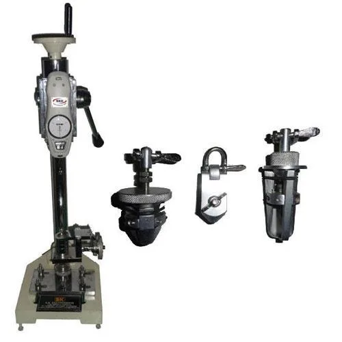Manual button snap testing machine, SS or MS construction, 20/30 Kg capacity. Features a manual display, 5g least count, and 35 KG weight.