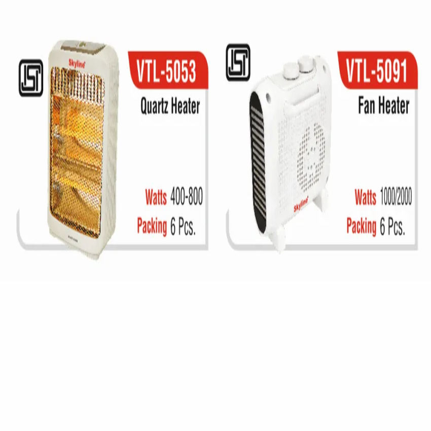 Skyline 500W electric room heater. Features ABS plastic body, copper heating element, speed control, thermostat, and overheat protection.