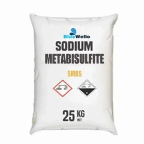 Industrial grade sodium metabisulfite in powder form. Packaged in 25 Kg bags for efficient handling and storage. 99% purity for effective disinfection and RO water treatment applications.