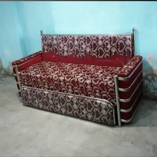 Sofa cum bed with a stainless steel frame. Frame weight is 50kg. Size dimensions are 6x6 feet. Robust and functional design.