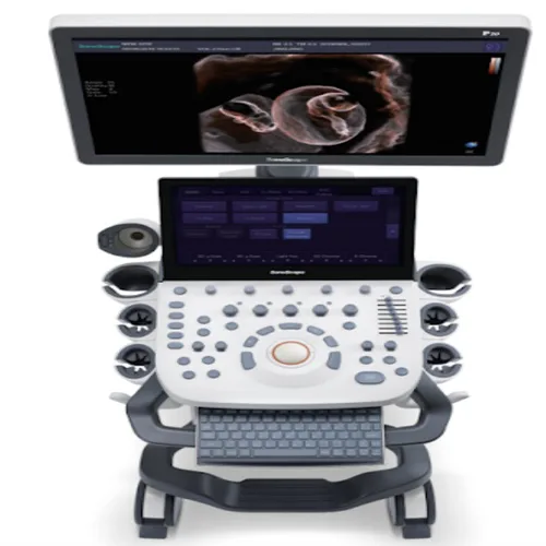 SonoScape P20 Ultrasound Machine with Color Doppler Velocity. Features 21.5-inch LED FULL HD monitor, 13.5-inch touch screen, 5 transducer ports, and 4D imaging technology. Includes USB, VGA, BNC, S VIDEO connectivity.