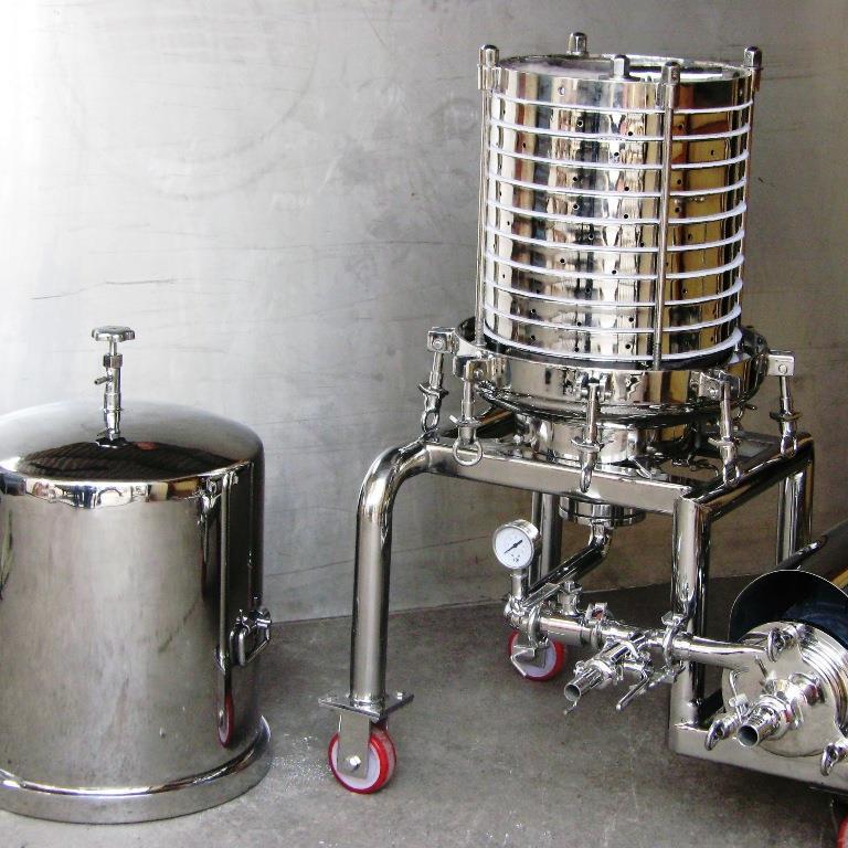 S.S. 316/SS 304 construction, 18" x 10 plates. Filters up to 12000 L/hr (viscosity dependent) at 2 kg max pressure with a 2hp motor. Operates at 100°C.