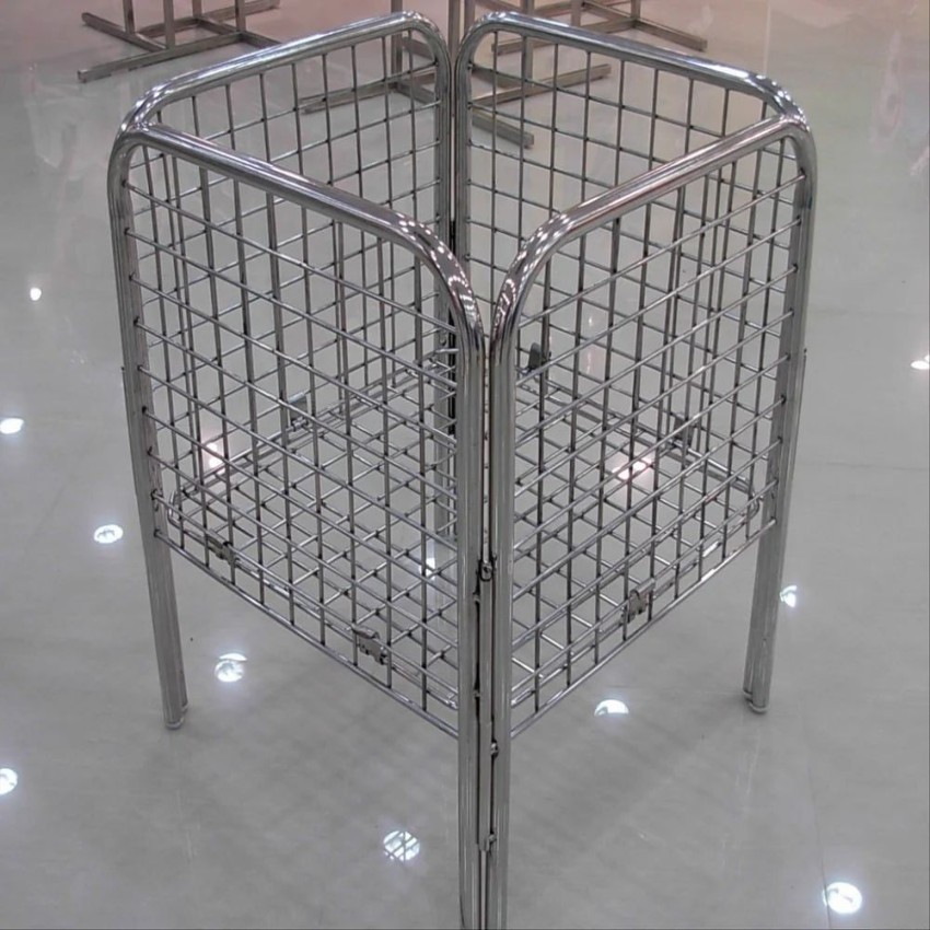 Square wire basket made of SS202 stainless steel. Silver polished finish, size 3x3x3.5 feet. Suitable for supermarket use.