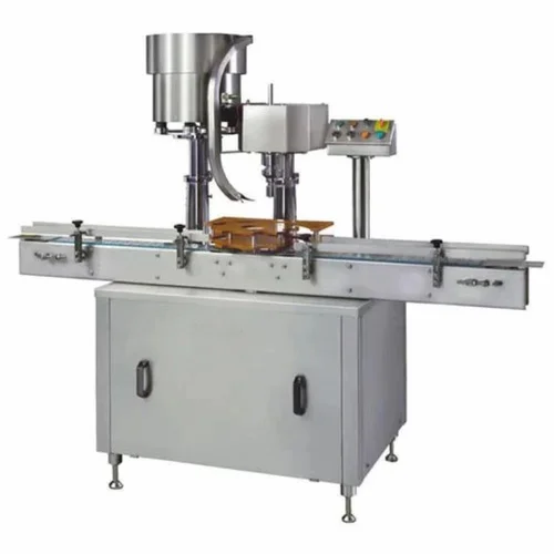 Automatic SS capping machine for industrial use. Features 30 BPM capacity, 1000 BPH production, and polished surface finish. Operates on electric power, weighs 200kg, with a 2-foot conveyor height.