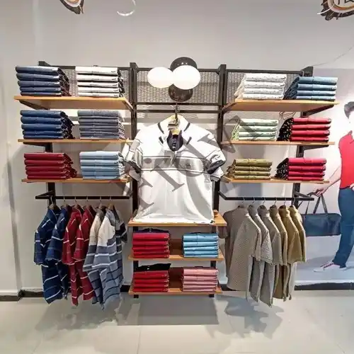 Five-layer stainless steel apparel storage rack for supermarkets. Each layer supports 50 kg. Durable construction for heavy-duty use in retail environments.