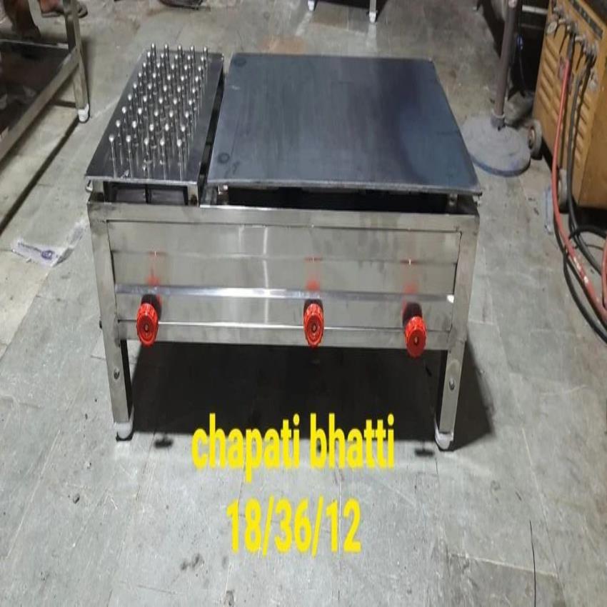 Silver stainless steel chapati bhatti cum puffer, hot rolled technique. Features 3 burners and measures 21x21x34 inches. Ideal for hotel use.