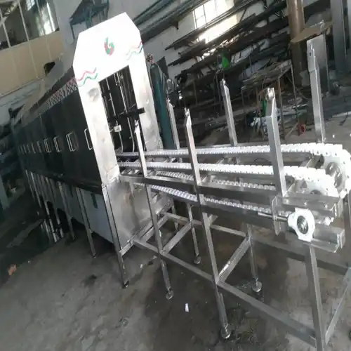This SS crate washing machine features front loading with 15hp power. Available in lengths of 10-40 feet, it offers a production capacity of 200 crates per hour.