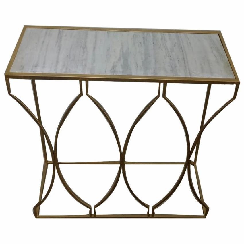 Rectangular, polished stainless steel coffee table with a marble top. Standard design, golden color, suitable for restaurants. Dimensions: 35x39x32 inches.