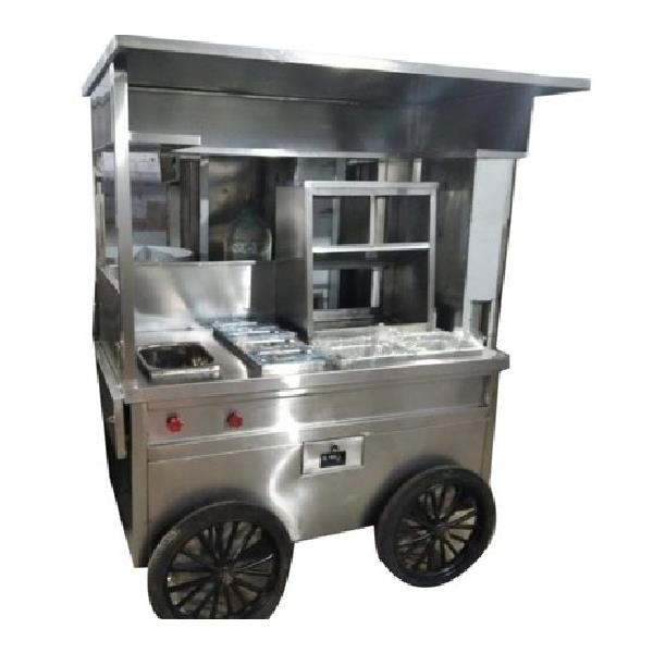 Silver stainless steel food cart, SS202 grade, measuring 8 x 7 x 5 feet. This robust cart provides ample space for food preparation and serving.