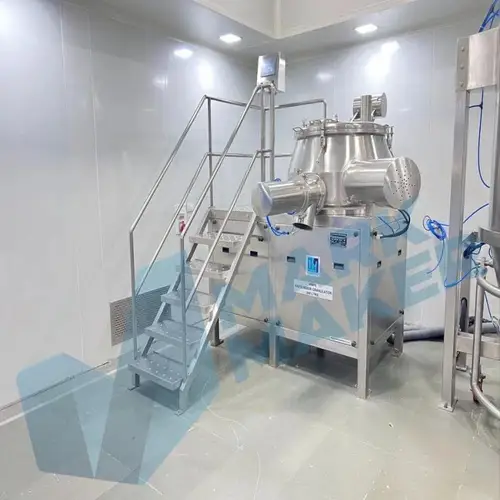 SS316/SS316L high shear mixer granulator for wet granulation. Capacity 3-1200 Ltrs, operating on 220V-415V. Made in India.