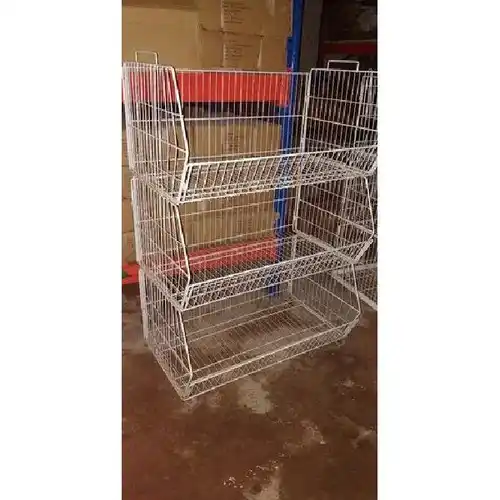 Square mild steel bin for supermarkets. Features stackable design with 100kg load capacity per layer. Durable construction for heavy use.