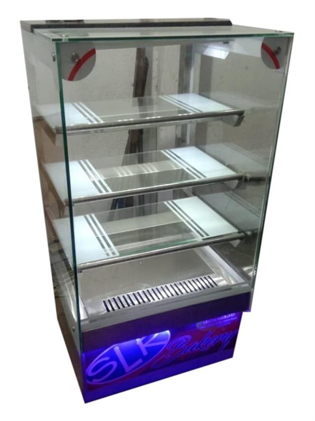 Rectangular stainless steel and glass display counter for bakeries. Features 3 shelves, transparent design, and integrated LED lighting for optimal product presentation.