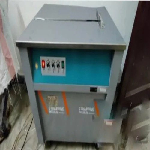 Semi-automatic stainless steel strapping machine for box packaging. Operates on 240VAC/50Hz, single phase, 250W power. High strapping speed. Dimensions: 897x570x785mm, 72 KG weight.