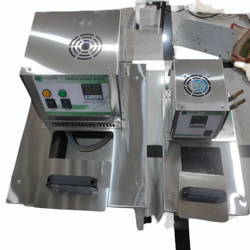 Automatic stainless steel oil circulating machine with digital display. Operates on single-phase 230V, 50Hz. Features a centrifugal pump. Compact dimensions: 400x300x200 MM. Made in India.