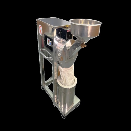 2-in-1 stainless steel pulverizer machine. Features 5 HP, 3-phase motor with 3750W power. Suitable for grinding spices and grains, made in India.