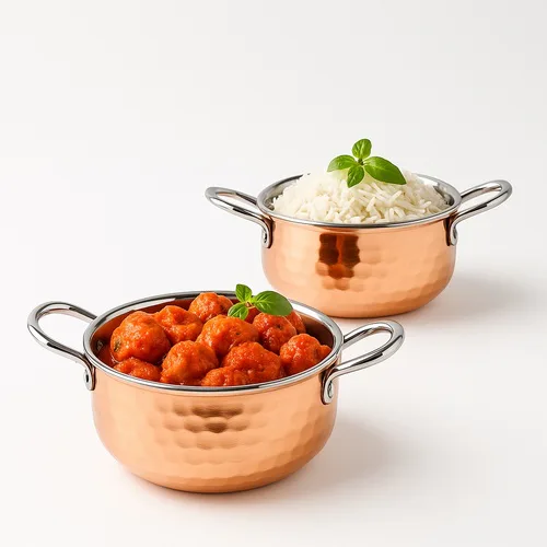 Stainless steel Punjabi Handi, golden color. 300 ml capacity, 13-inch diameter. Made in India. Suitable for kitchenware and serving.