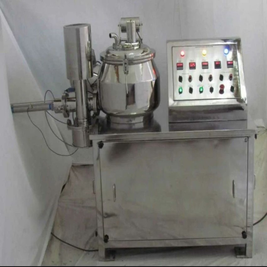 Free-standing rapid mixer granulator. SS 316/304 grade. Powder coated finish. Lifts dried granules 80 degrees. BIN or IPC container compatible.