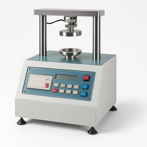 Semi-automatic Ring Crush Tester made of stainless steel and mild steel. Operates on 220V/380V single phase power, with a digital display for accurate readings.